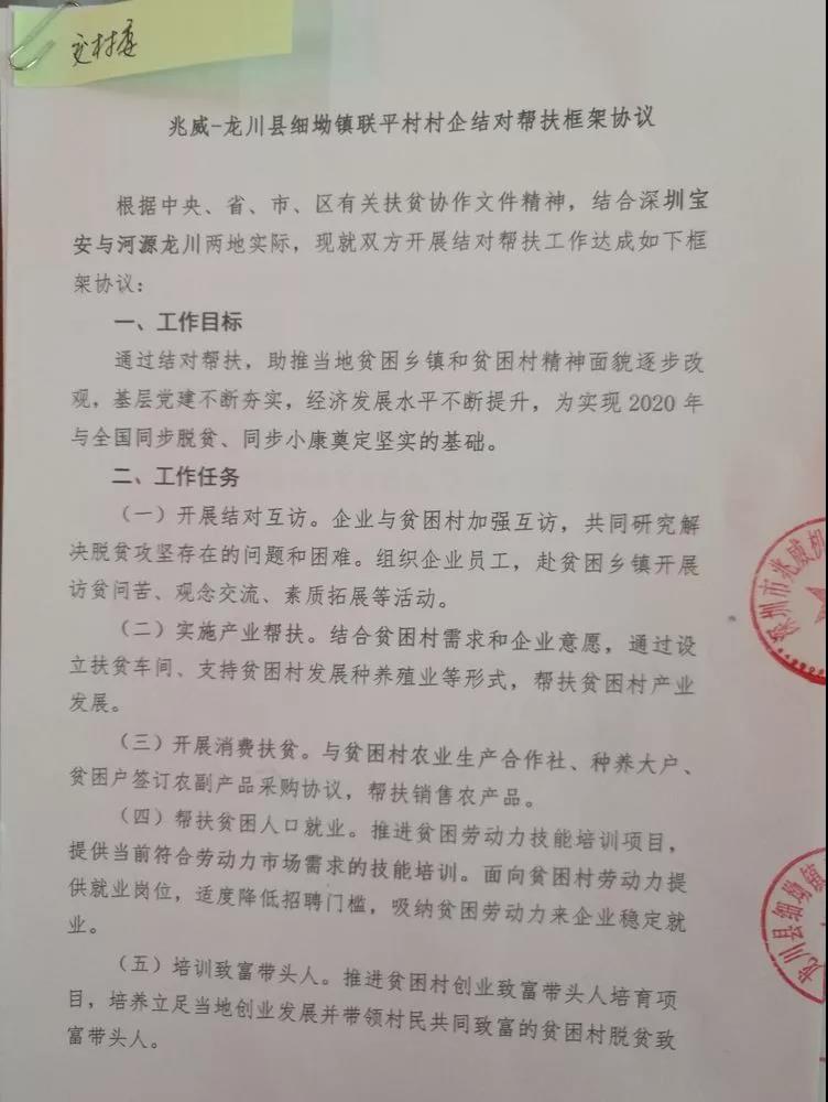 此项对口结对帮扶是由宝安区委组织部、区工商联以及区工业信息局组织的“百企帮百村”对口扶贫三年工作计划内容之一,将强化消费扶贫、党建共建共治、产业长效扶贫、村基础设施建设、进一步帮扶村内特困户等工作,强化宝企社会责任,同时为宝安区扶贫事业助力添色。