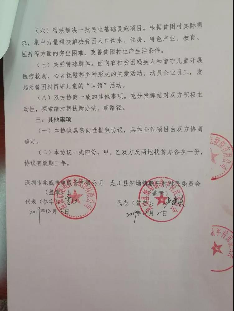 2019年12月4日,深圳市j9国际站官网首页直达机电股份有限公司党支部陈瑞哲书记、总经办李经理一行到河源市龙川县细坳镇联平村开展了村企结对帮扶和交流工作。期间,我司与村党委一是签订了村企结对帮扶框架协议并互换存底;二是召开会议互相交流双方党支部及基层基本情况,拟订未来一年的帮扶工作计划和具体措施;三是共同到细坳镇电商服务站联系首期合共2.8万元对口村贫困户的农产品消费扶贫采购工作;四是组织到村内参观村容村貌并到两户贫困户家中开展慰问访问和发放慰问品活动。