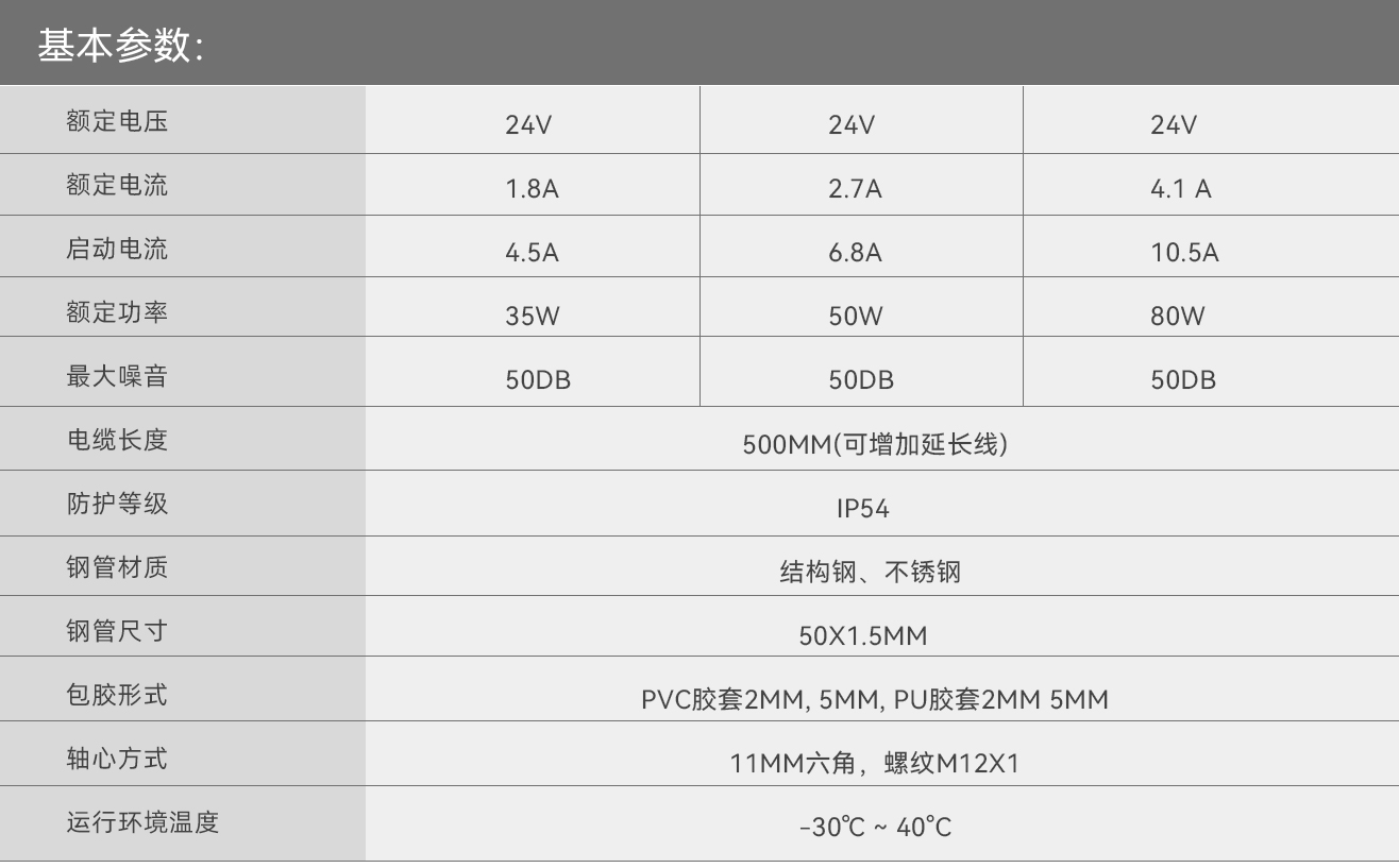 ±ê×¼»¯²úÆ·:Ò»°ã¹öͲµç»úµÄ³¤¶ÈΪ250~1500mm£¬Ö±¾¶Îª50mm¡¢60mm¡¢76mm¡¢80mm¡¢89mm¡£ÎªÁËÂú×ã¿Í»§¸öÐÔ»¯µÄ¶¨ÖÆÐèÇó,¿Í»§¿É¶¨ÖÆ800mmÒÔÉϵĹöͲµç»ú£¬ÇÒ¿É´øÓжàÖÖÁ´½Ó·½Ê½£ºÖ±Í¨Ê½¡¢Ëܽº¶àШ´ø¡¢½ðÊô¶àШ´ø¡¢¸ÖÖÆË«Á´ÂÖ¡¢Í¬²½´øÂÖ£¬Ö§³Ö±ê×¼»¯Éú²úÖÆÔì¡£