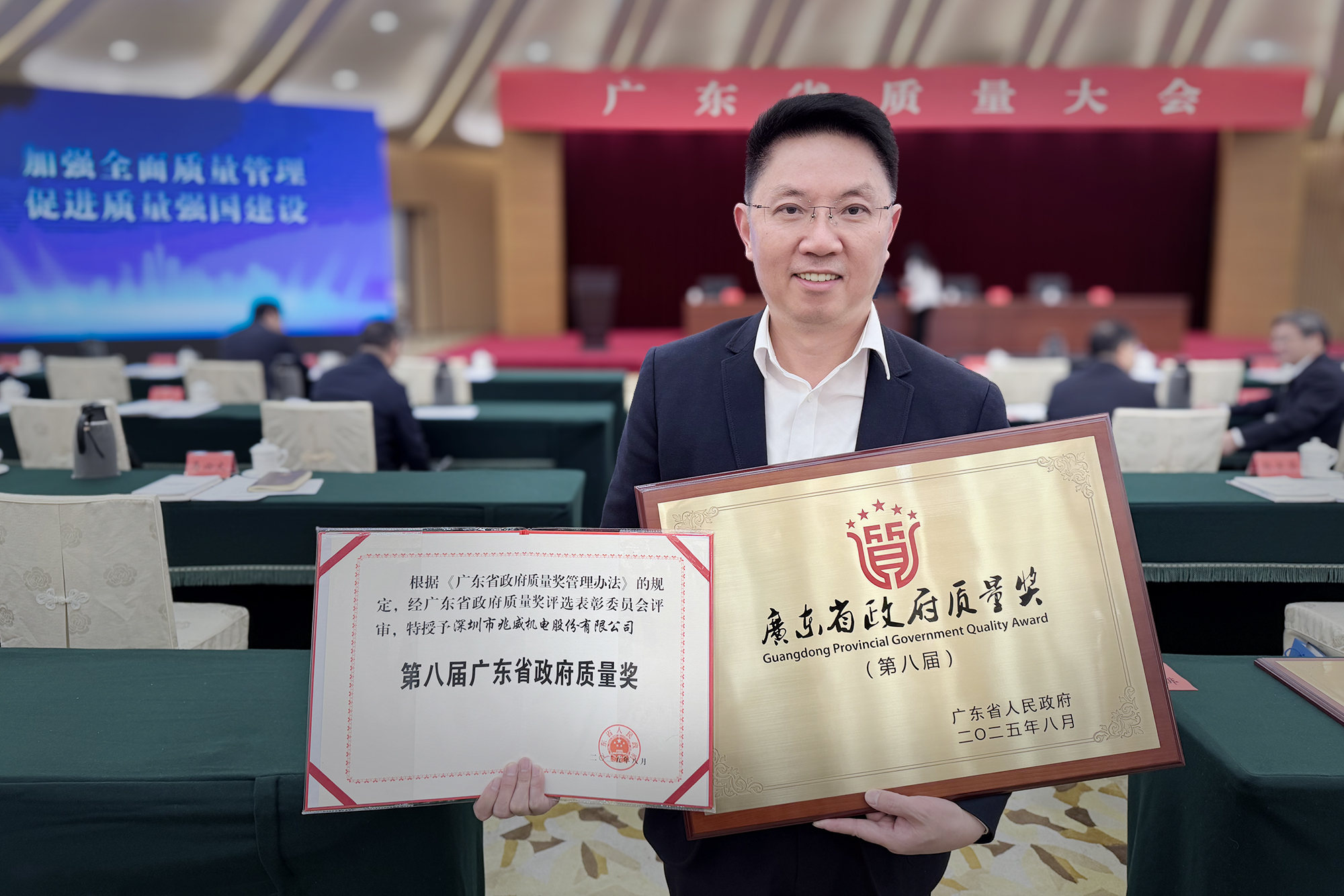 喜讯捷报传,荣耀启新程!2025 年 11 月 26 日,广东省质量大会上,深圳市j9国际站官网首页直达机电股份有限公司董事、总经理叶曙兵先生正式接过第八届广东省政府质量奖奖牌。j9国际站官网首页直达机电是2025年深圳唯一入选企业,跻身全省仅 10 家的获奖名单,用卓越实践铸就质量领域的至高荣光。